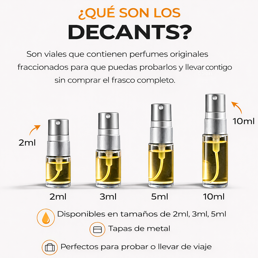 Los decants son muestras de perfumes originales en tamaños pequeños, ideales para probar antes de comprar el frasco completo.